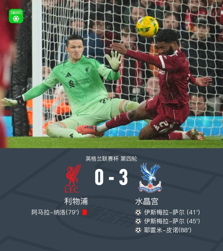 英联杯利物浦0-3遭水晶宫淘汰,伊斯梅拉-萨尔双响,纳洛直红