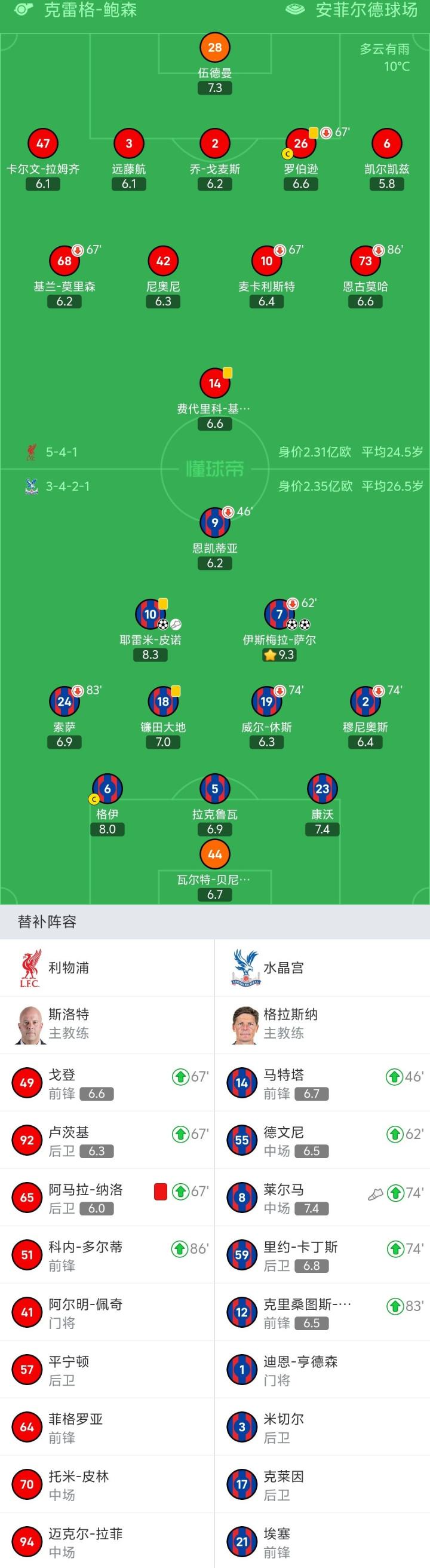 第67分钟,利物浦进行换人调整,麦卡利斯特、罗伯逊、莫里森被换下;而水晶宫则保持了阵容的稳定。